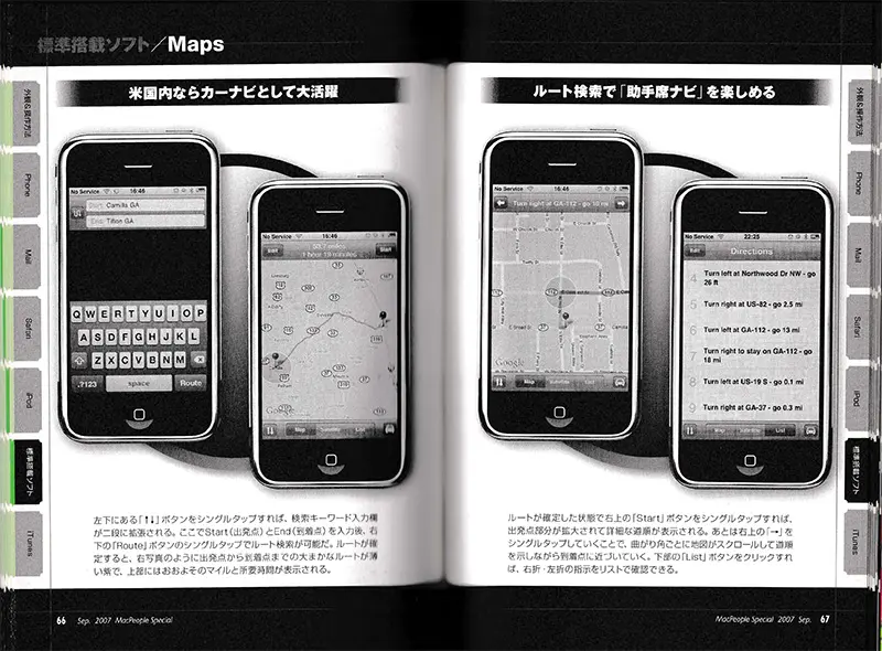 それから16年後、まだ日本でiPhoneが発売されていなかった時(2007年9月)に「MacPeople」の付録でiPhoneの機能を紹介した冊子のなかでは、すでにgoogleマップのルート検索が紹介されています。今ほど詳細な情報ではないけれど、iPhoneが最初からいろんなサービスを取り込んで社会を変えようとしていたことが伺えます。